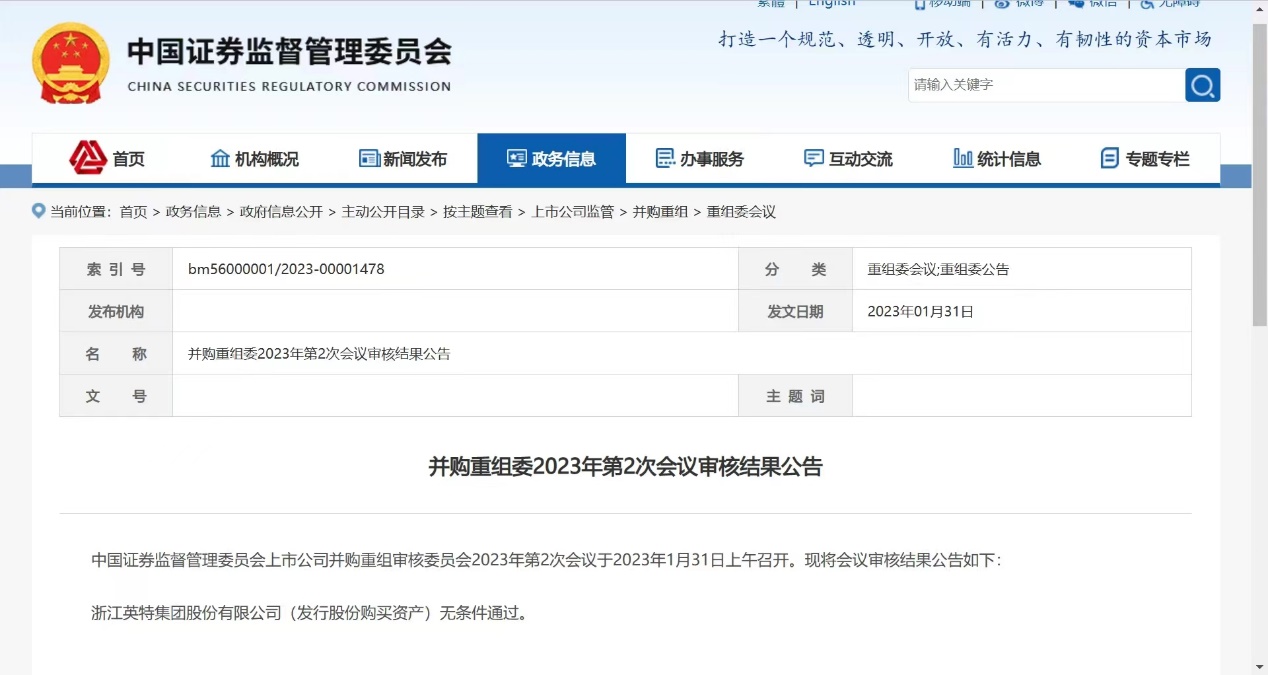 2023年1月31日,公司黨委書記、董事長(zhǎng)應(yīng)徐頡帶領(lǐng)公司董事會(huì)秘書譚江、財(cái)務(wù)負(fù)責(zé)人金小波以及獨(dú)立財(cái)務(wù)顧問財(cái)通證券等中介機(jī)構(gòu)組成的答辯團(tuán)隊(duì),向中國證監(jiān)會(huì)并購重組審核委員會(huì)就公司重大資產(chǎn)重組事項(xiàng)進(jìn)行了匯報(bào)和問題答辯,經(jīng)其審核,我司重大資產(chǎn)重組項(xiàng)目獲得無條件通過。